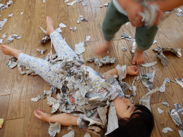 部屋で新聞破りをして遊びました。ビリビリと新聞を破いたり、