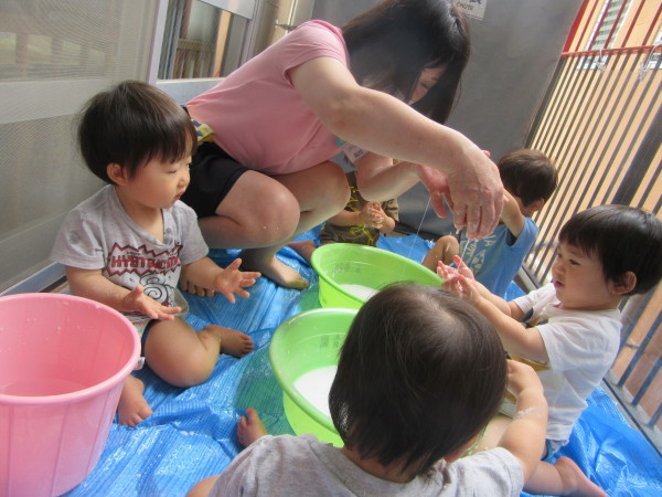 片栗粉粘土遊びをしました。粉末状の片栗粉を触ると、「サー(サラサラ~)」と